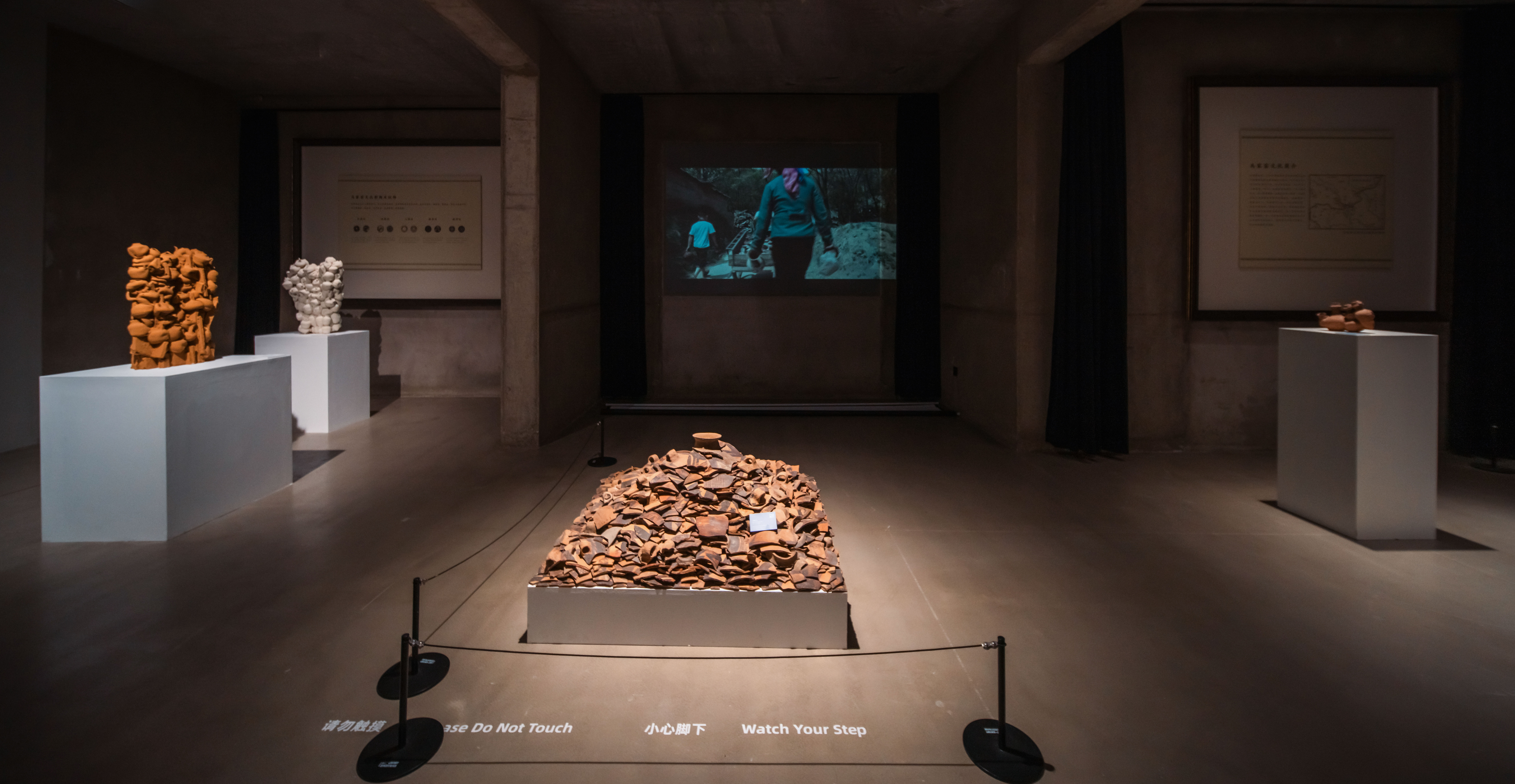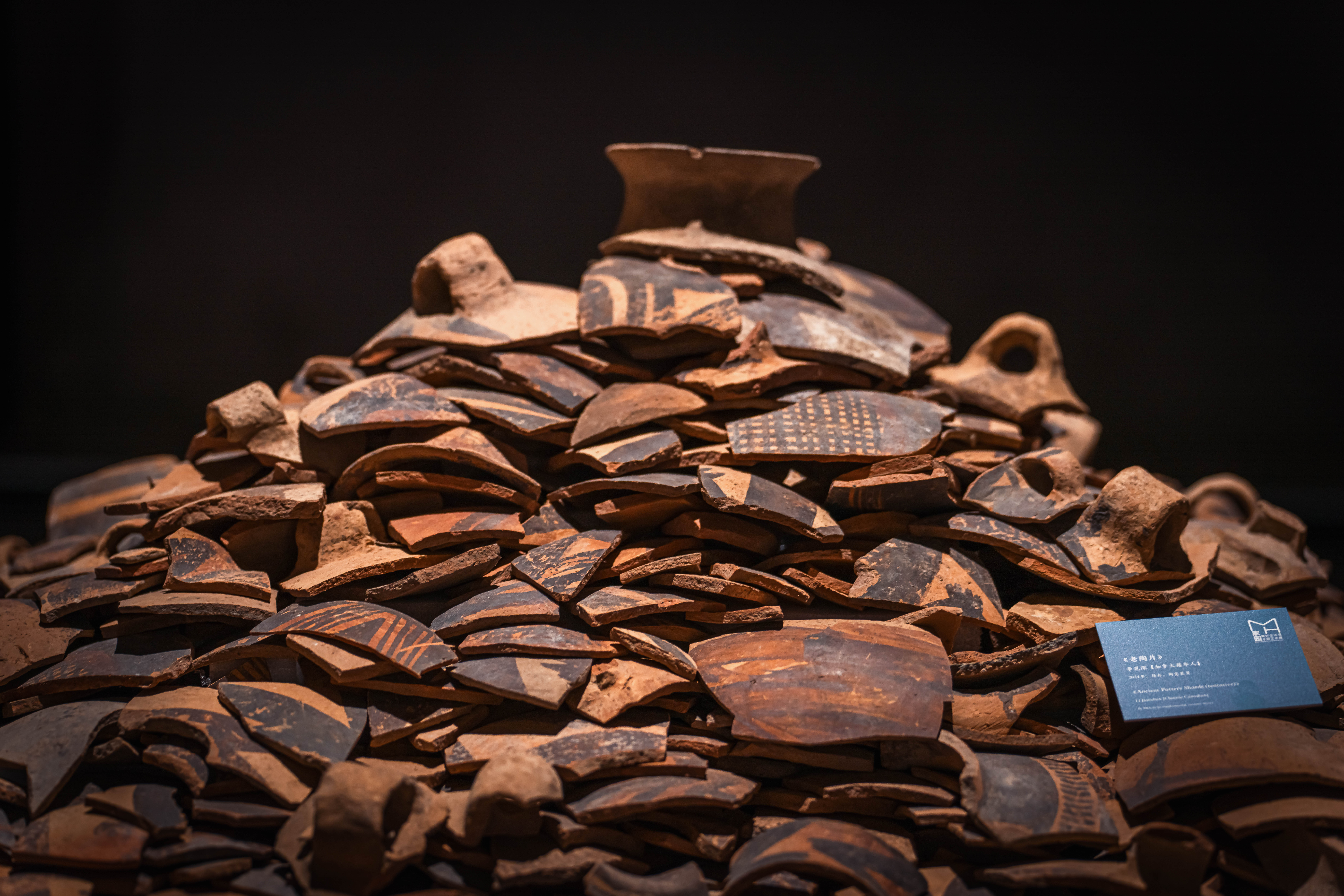 走进展区,一组由马家窑文化彩陶残片堆叠而成的装置引人注目。这些带有彩绘的陶片是李见深珍而视之的老古董,被他亲手拣选并汇集于此,形成了新的生命体。李见深说到,这一系列作品都是扎根于马家窑,使用的是5000年前先民所用的原料,但他注入了自己的概念与思考。