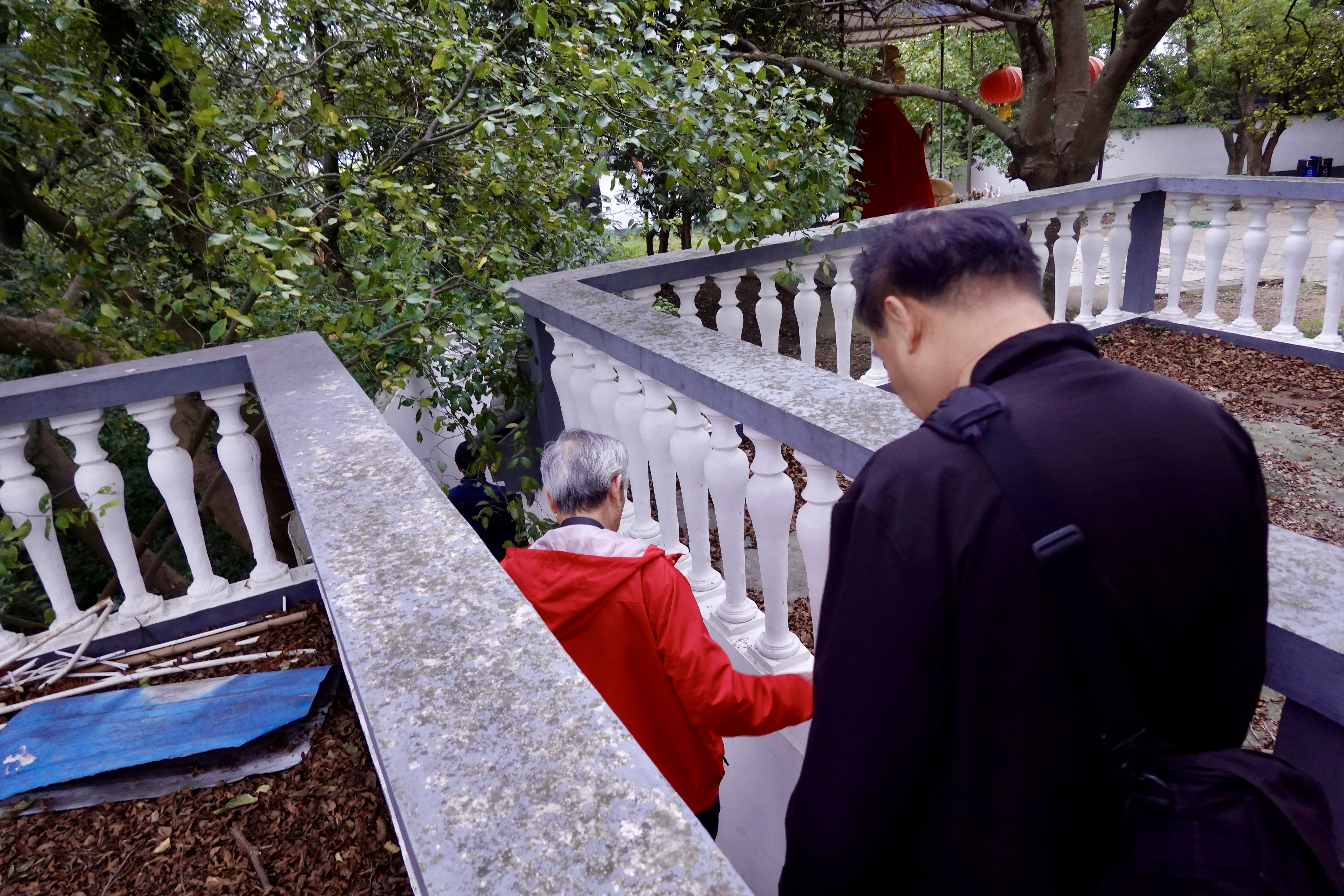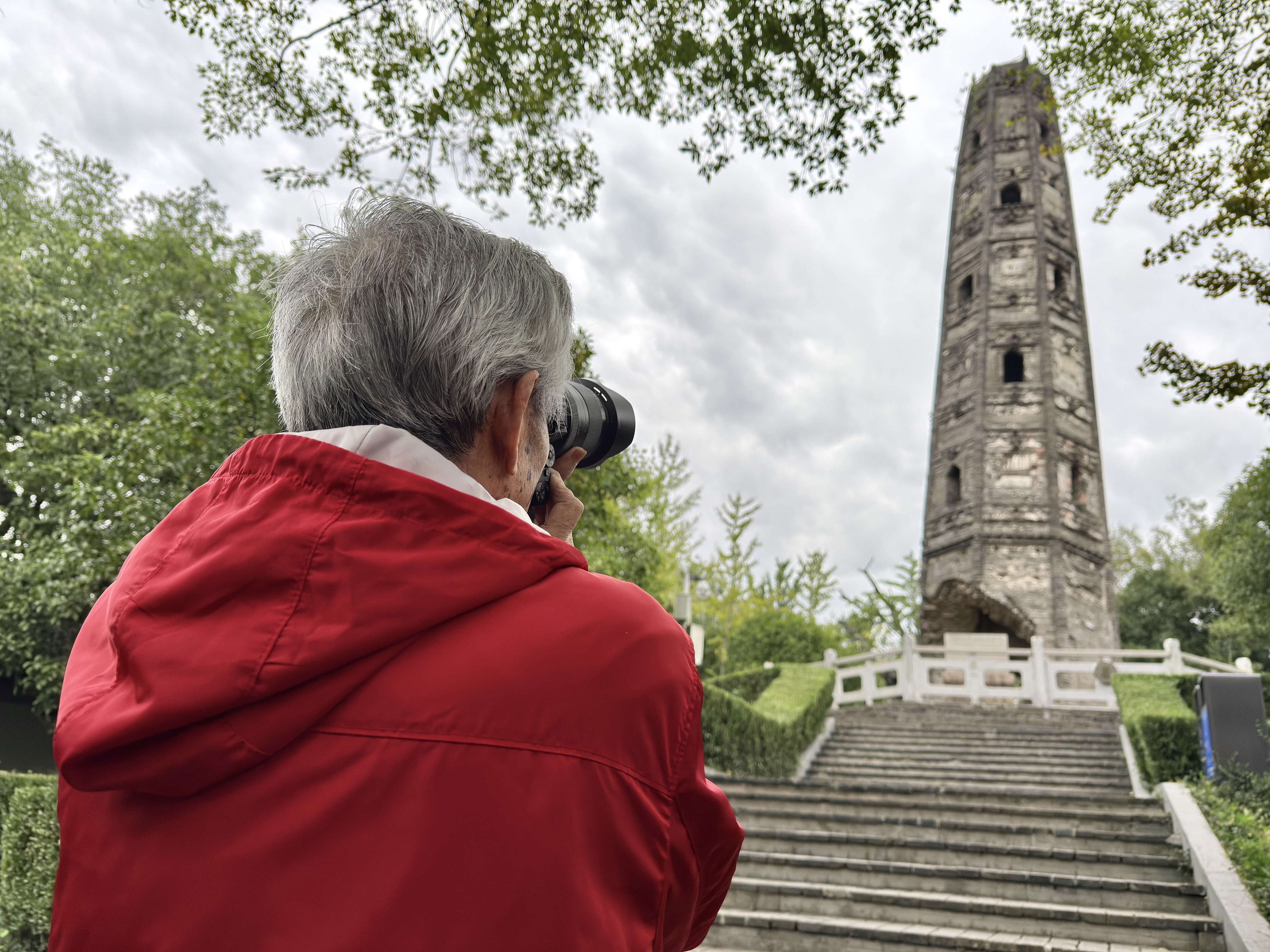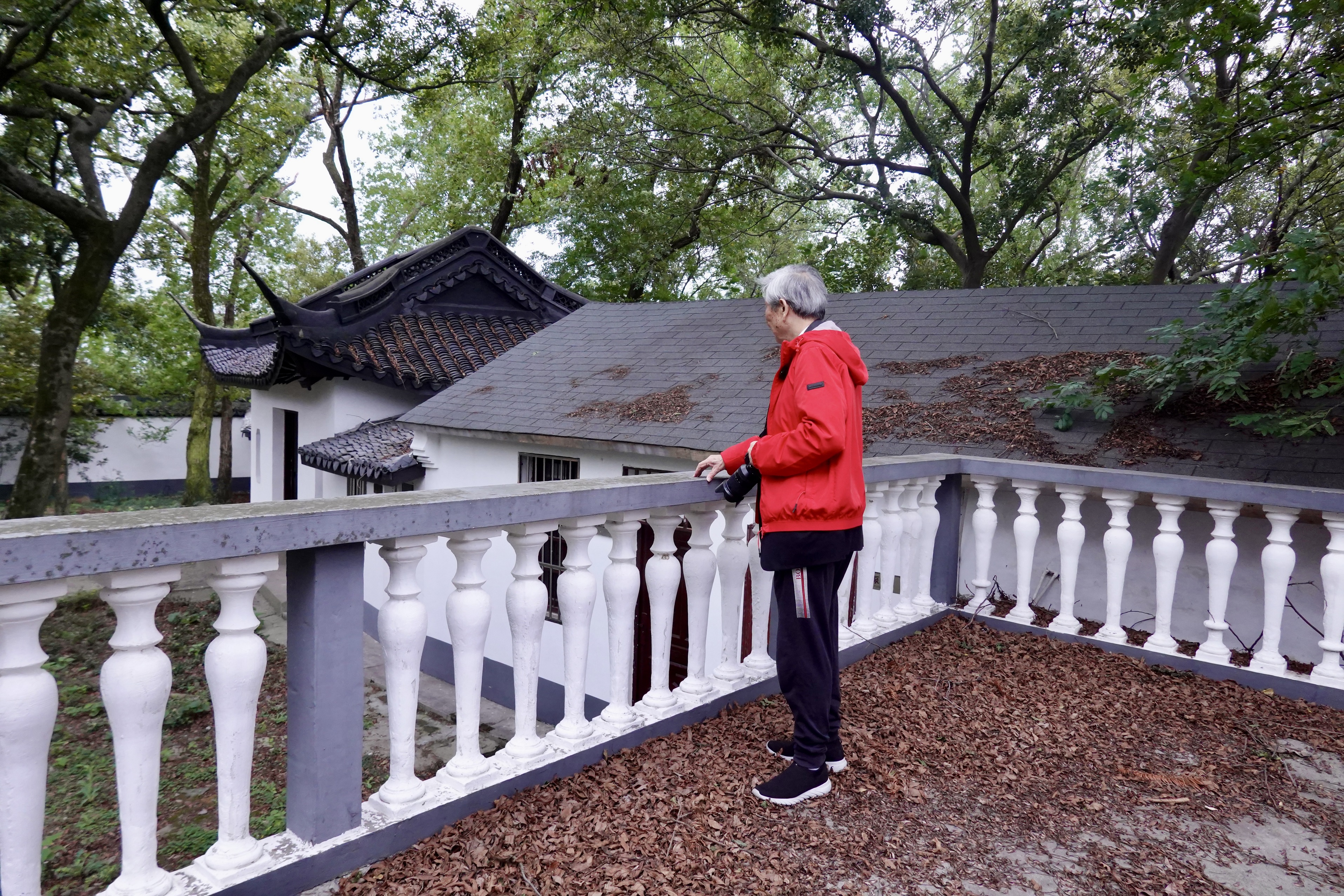 陈老绕着塔转了几圈,他发现塔周围的房檐古朴雅致,为了找到最佳角度凑近拍照记录细节,于是躲过我们的视线,抬腿就越过灌木丛,“闯进”满是落叶的一块空地,那里厚积的落叶一层又一层,足以没过小腿,他就那么深一脚浅一脚地一路拍过去……全然不顾我们在后面大喊小心。