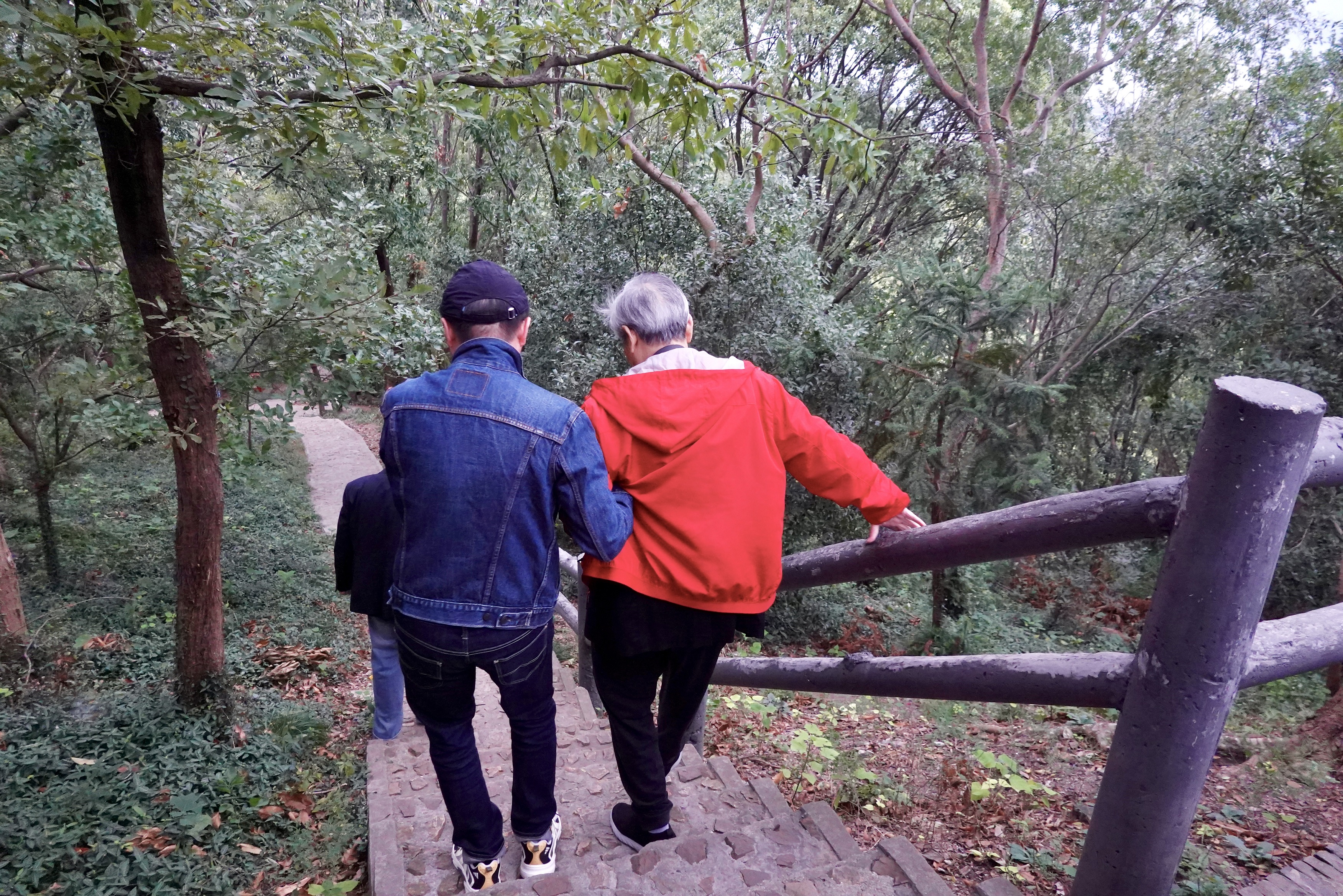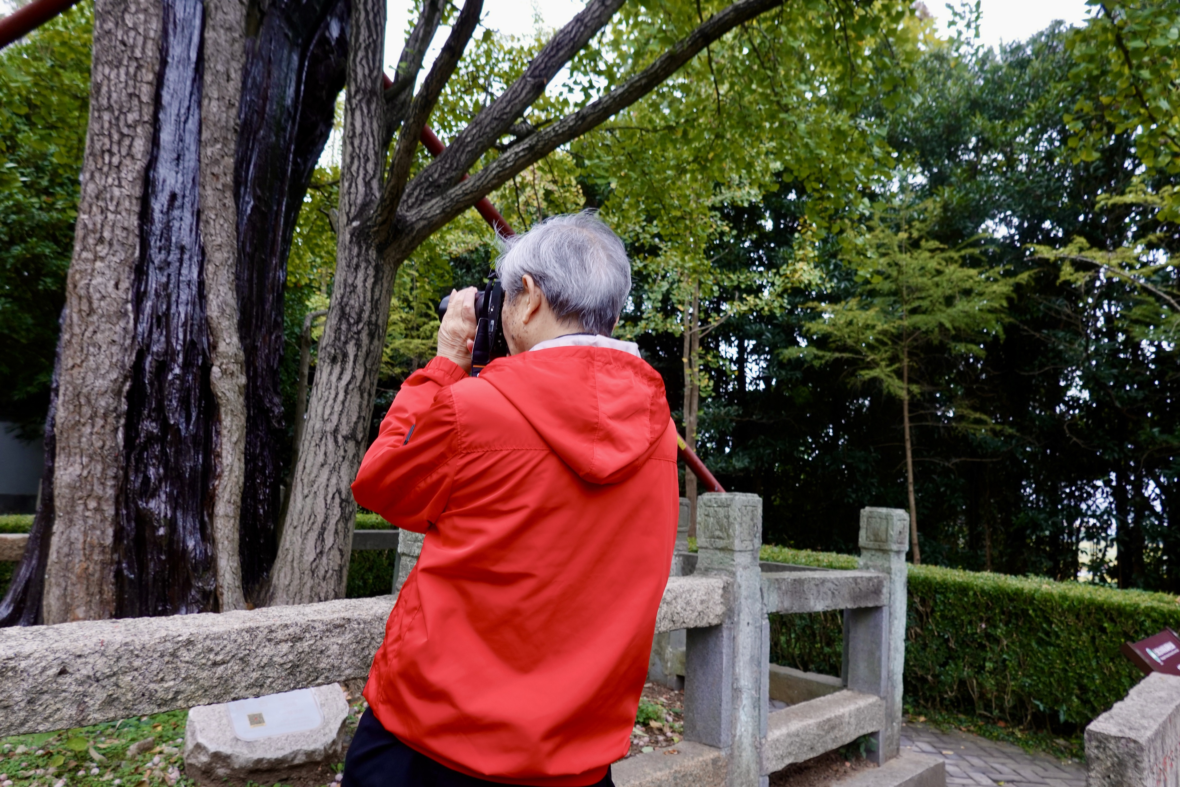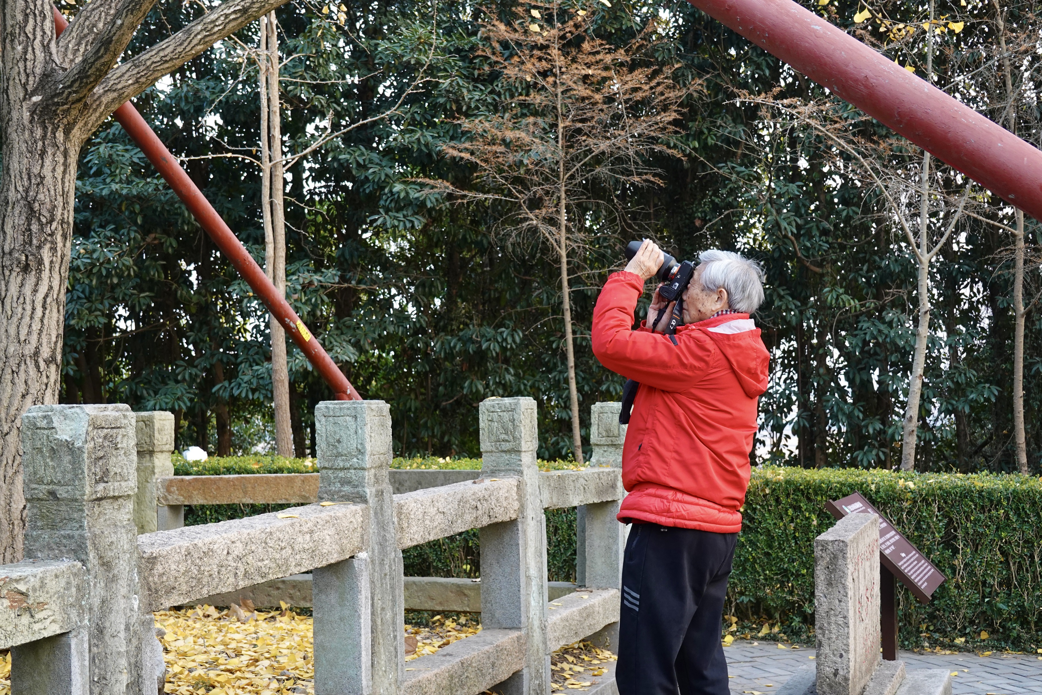 陈老绕着塔转了几圈,他发现塔周围的房檐古朴雅致,为了找到最佳角度凑近拍照记录细节,于是躲过我们的视线,抬腿就越过灌木丛,“闯进”满是落叶的一块空地,那里厚积的落叶一层又一层,足以没过小腿,他就那么深一脚浅一脚地一路拍过去……全然不顾我们在后面大喊小心。