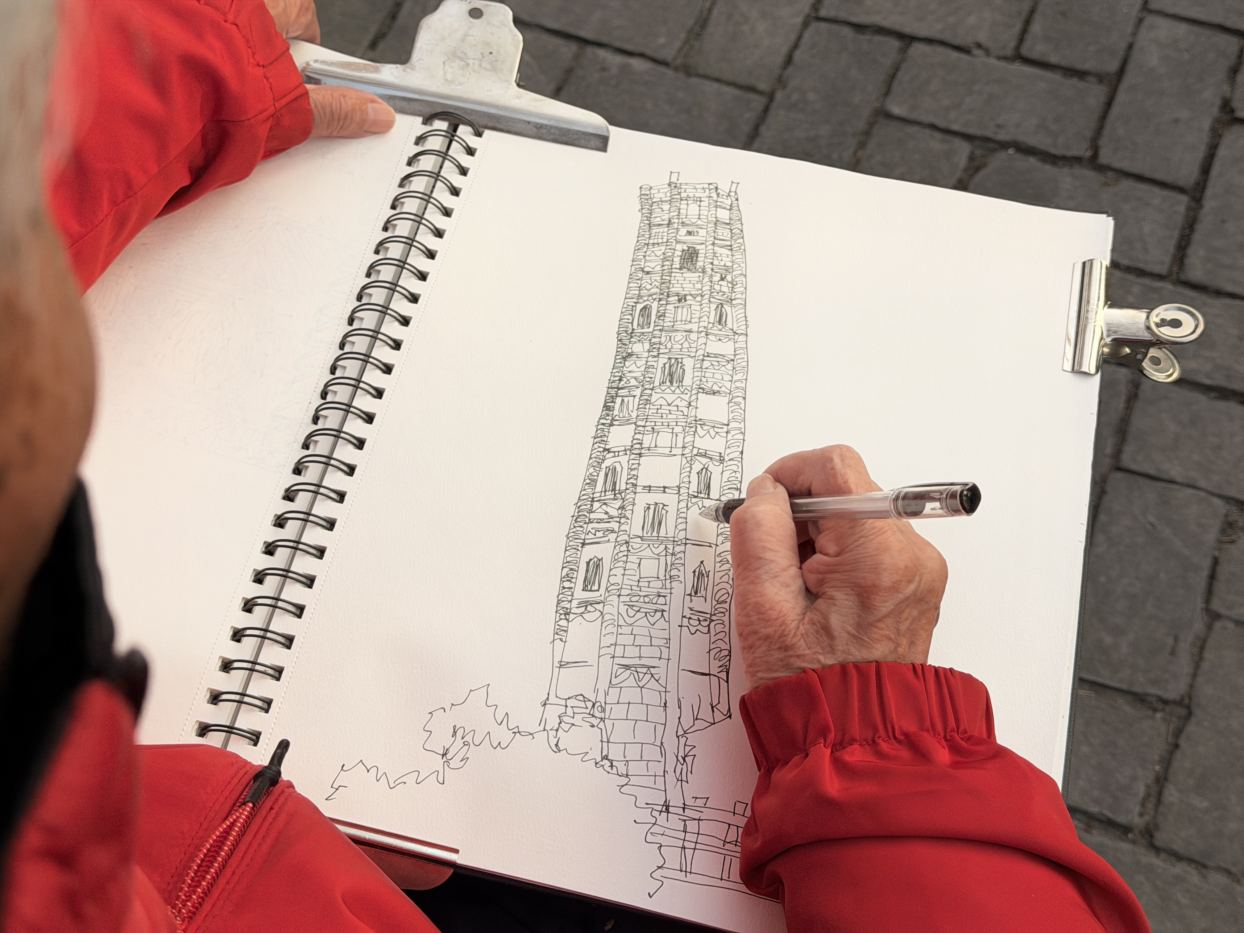陈老看准角度,就现场写生起来,时不时有过往游客凑近旁观。期间他变换了三、四次位置,一直画到日影西斜,那天我记得落日极辉煌,在一棵硕大的树冠中慢慢沉下,如同镶嵌在树冠上的金色“鸟巢”。