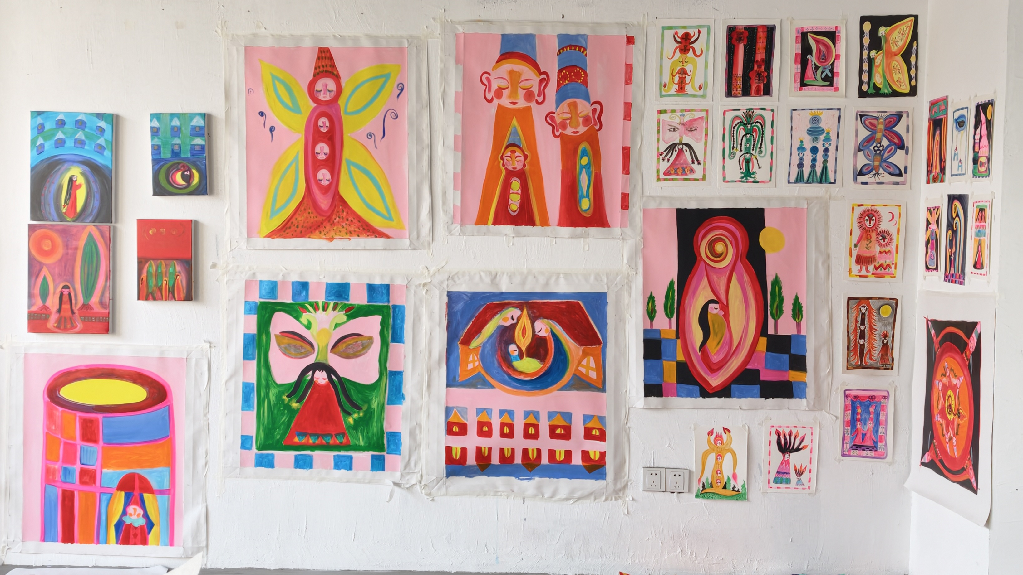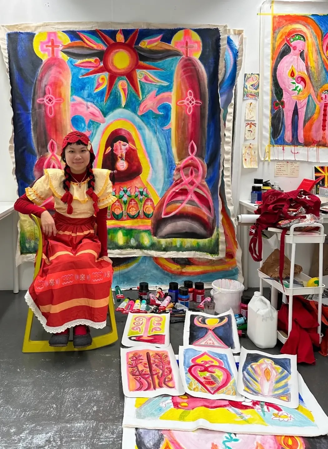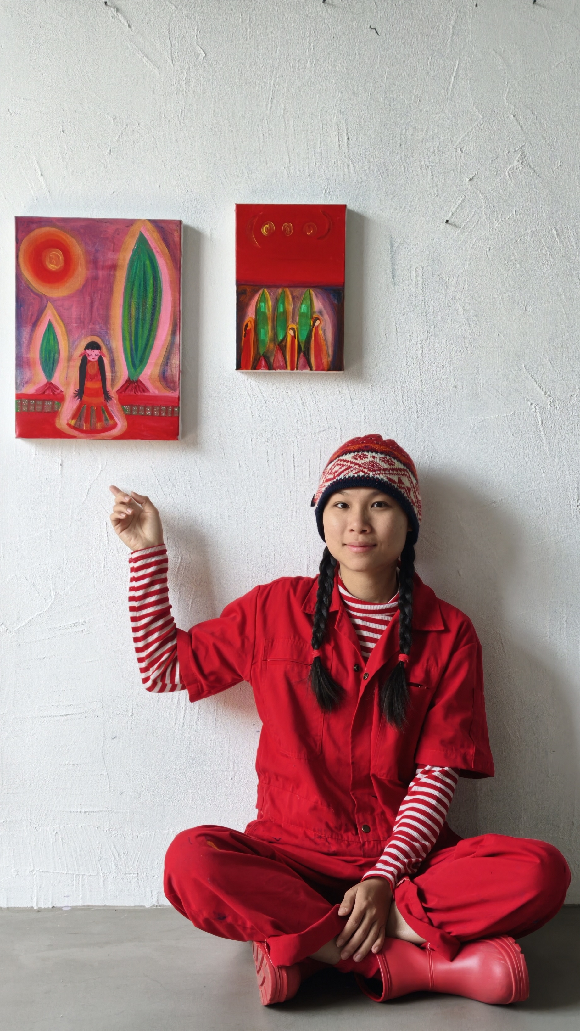 黄馨,1998年出生于中国台湾,2024年获英国皇家艺术学院版画系硕士学位。她的创作根植于荣格心理学与神秘学,跨越绘画、版画、纺织与装置,以鲜艳色彩与象征性的符号,描绘内在的精神世界。画中的女性形象常以祈祷或冥想的姿态出现,象征着原始而强烈的女性能量,以及对内在平衡与灵性觉醒的追寻。她在中国台湾举办过多场个展,也曾参与英国伦敦、加拿大温哥华等地的国际联展。作品获英国皇家艺术学院收藏,并受到《Suboart》等艺术期刊关注。2025年,她先后受邀前往中国佛山与韩国虹梯艺术中心参与驻留项目。