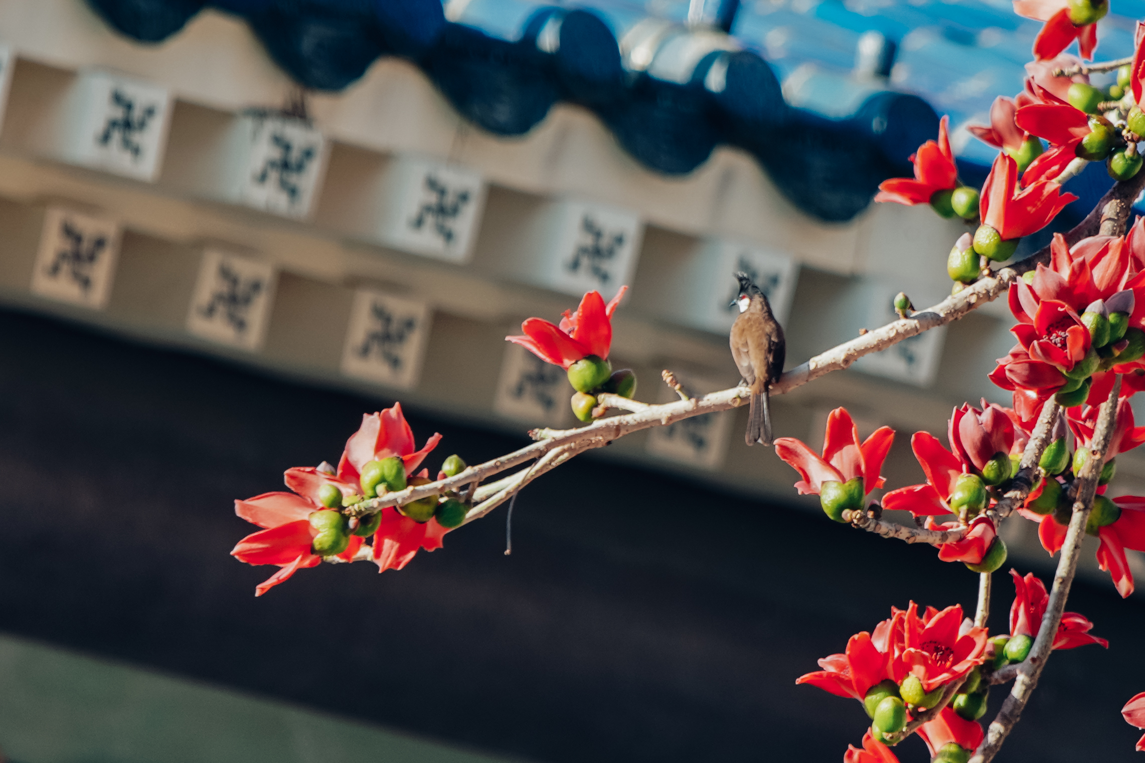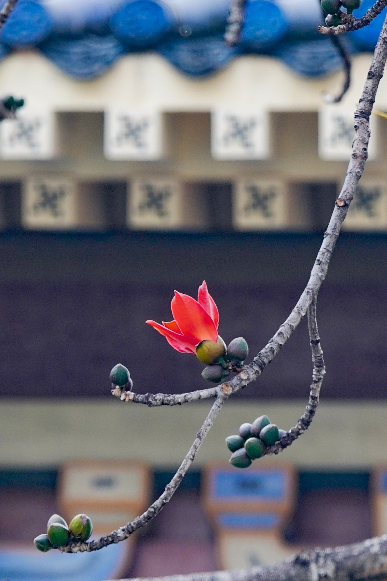 中山纪念堂古朴典雅的蓝色琉璃屋檐与盛放着的红色木棉花交相辉映,俨然一派浓郁的南国气息。听中山纪念堂的工作人员介绍,广东人称木棉花是“英雄花”,而且木棉花的花瓣晒干后还可以用于煮粥或煲汤,清热除湿,树皮是滋补药,种子油可做肥皂,木材清软可造纸,花大而美,树姿巍峨,可为观赏树,木棉树对于广东人来说,浑身都是宝。