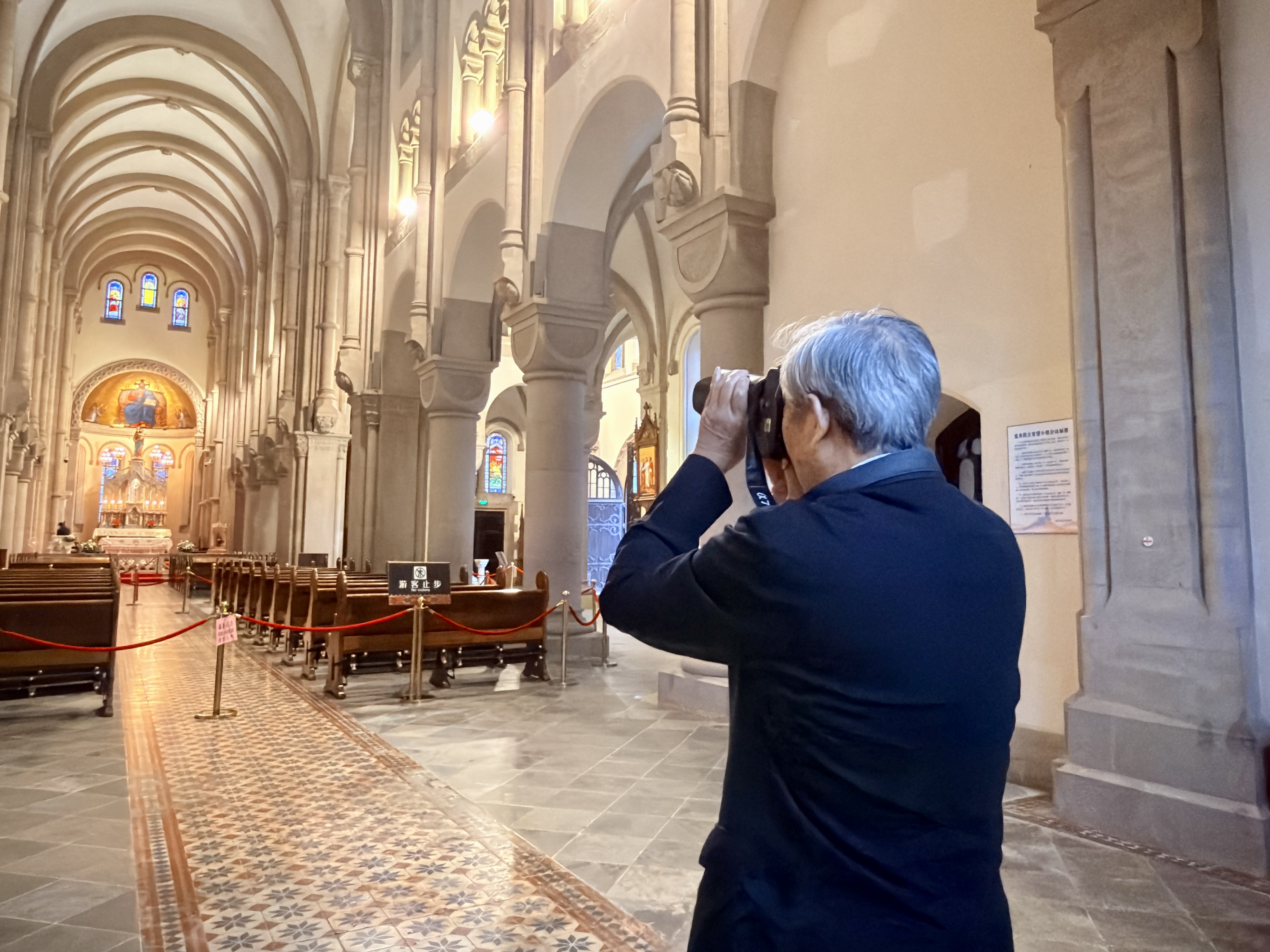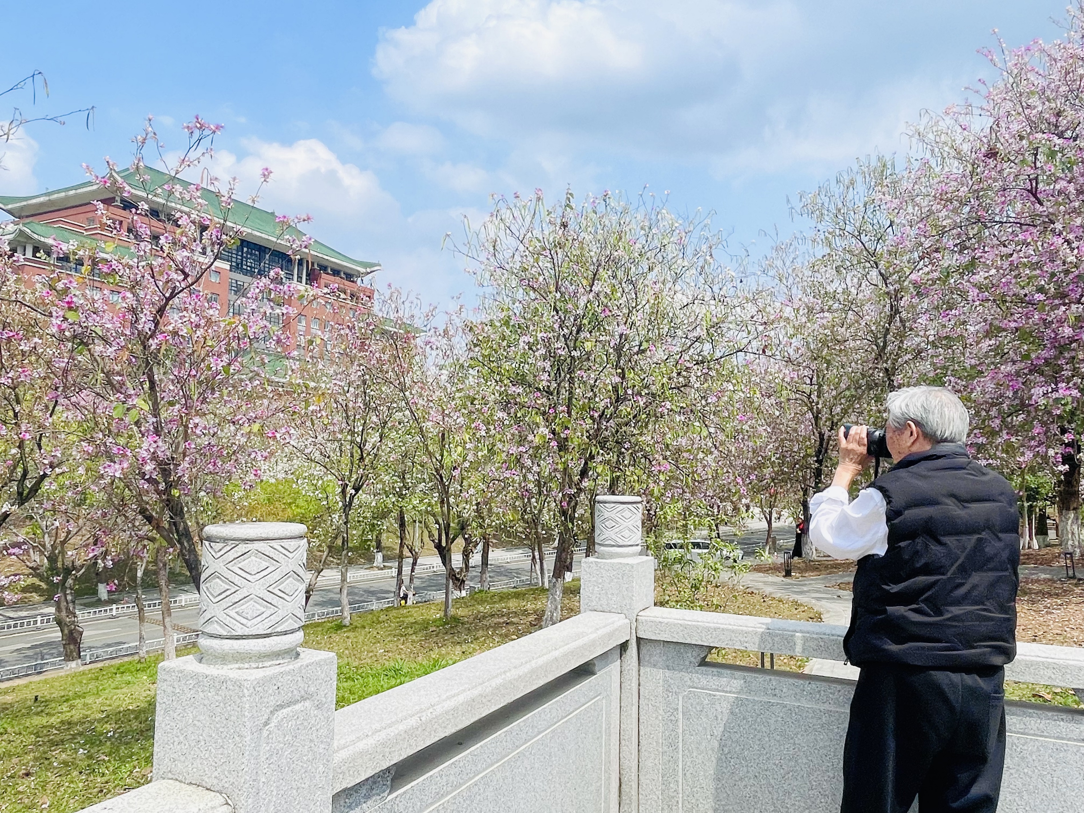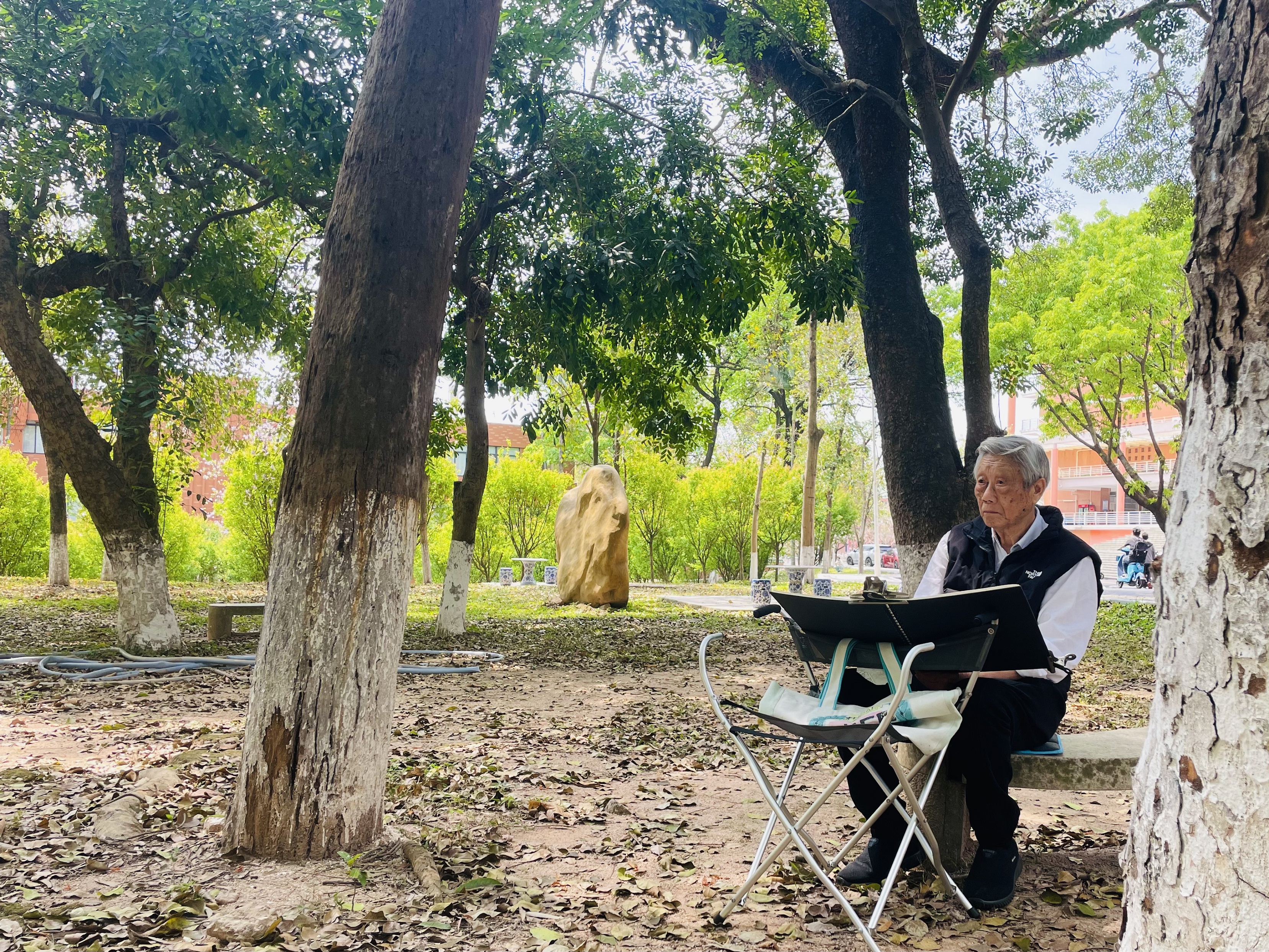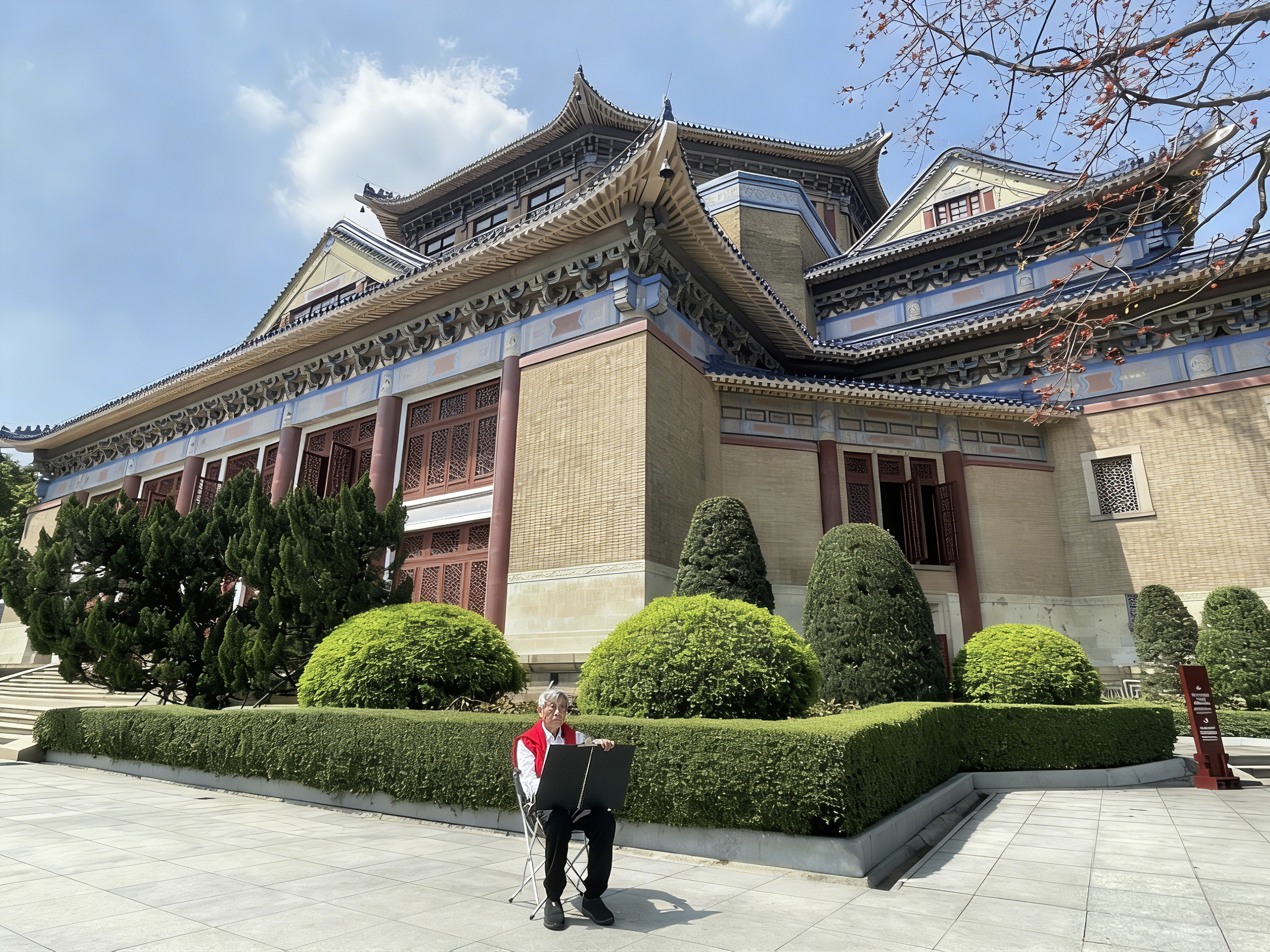 这次到广州的采风写生,还有一个明确任务,就是画木棉花。因为陈老首先想到,上海市花白玉兰与广州市花木棉花,市花深蕴着城市的品格,两种花卉就是两地文化对话的表征。听说现在正是木棉花的花期,我们第二天就赶往广州的中山纪念堂。据说,这里是观赏木棉花有名的打卡地。我们沿着公园转了一大圈,陈老终于选好一块“宝地”。相机、折叠椅、速写本、水笔,这些年成了陈老走南闯北采风写生必备的“四件套”。