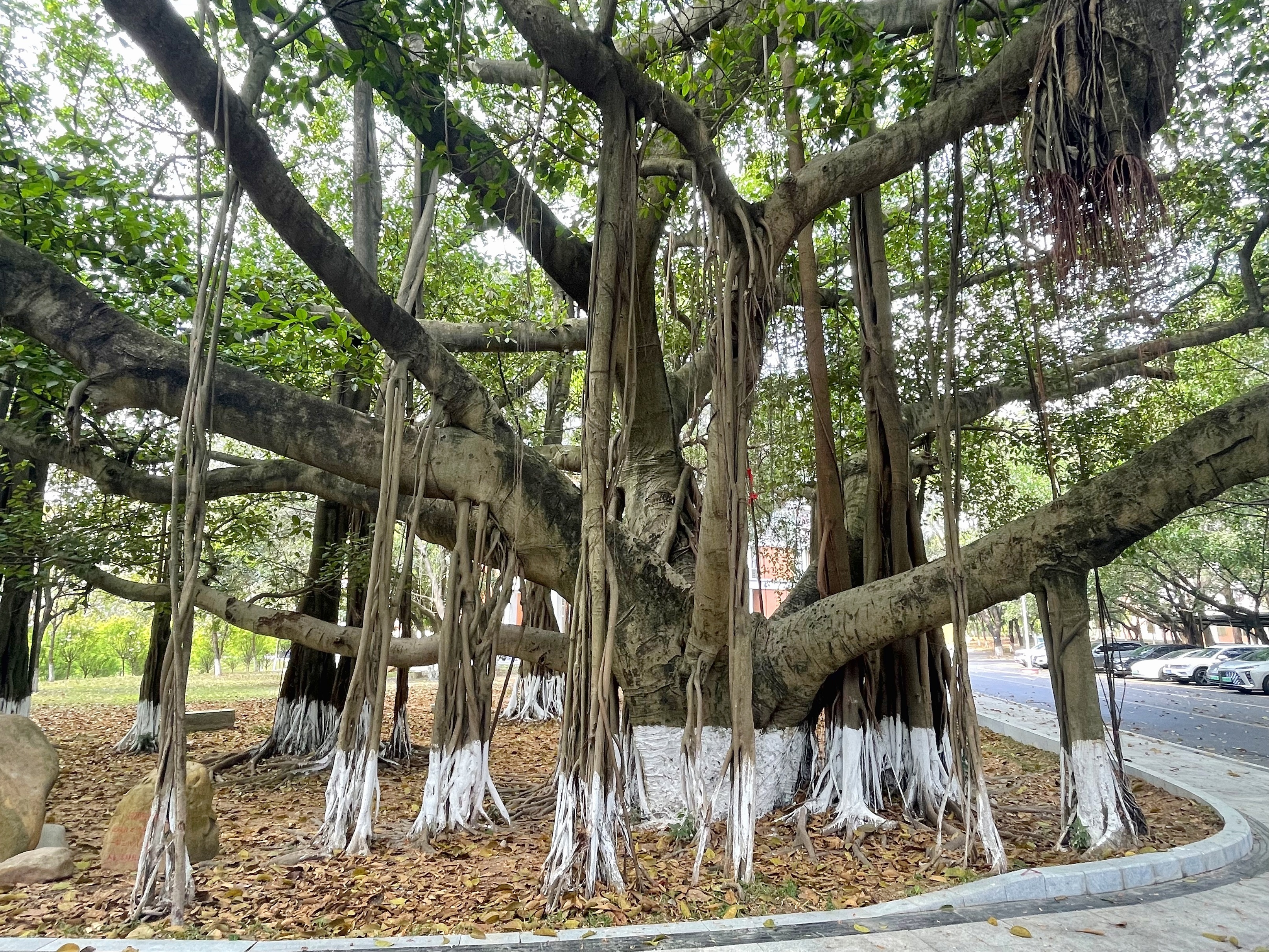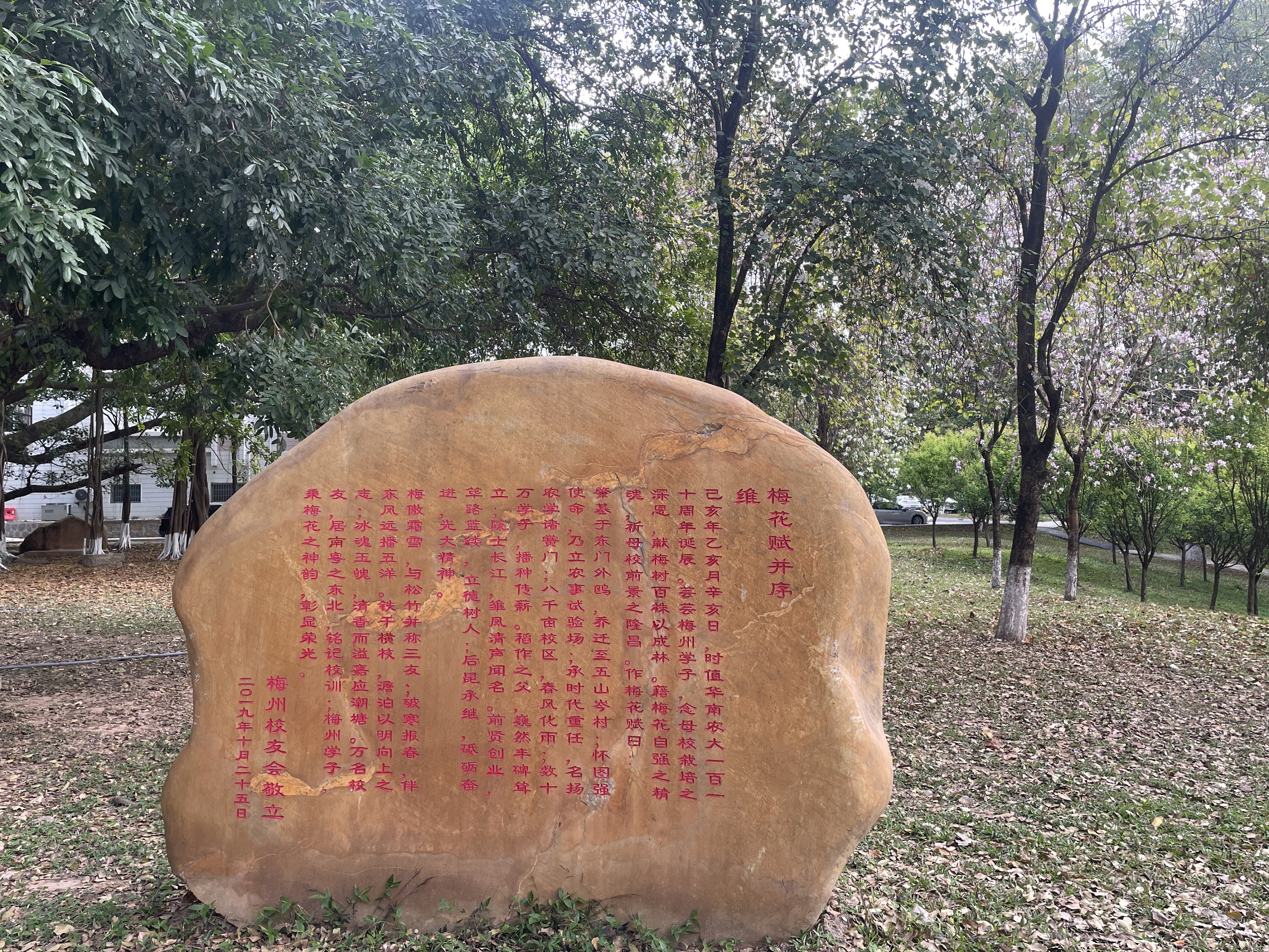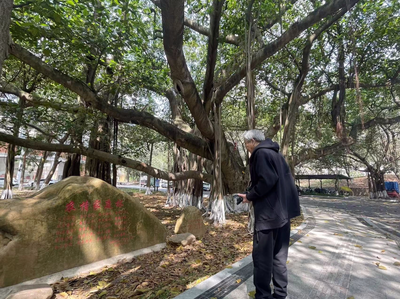 第二天,我们又去了华南农业大学的校园,这里有一棵近百年的高山榕树……树冠开阔、浓荫如盖,树冠犹如一把大伞。在榕树旁还有百株梅林,是华南农大110周年之际,梅州学子感念母校栽培所植。陈老在这棵榕树周围仔细观摩写生,他很感慨:“榕树象征了广东人那种落地生根、意气风发的精神。同时我也感触很深,因为这些树木这么漂亮,保护得这么好,也是一大人文景观。尤其在农业大学,他们周围环境实在太漂亮了。这里还有块碑,记录着农大的学子们对学校、老师表达的感恩之情。我认为,这个榕树有点像人文与自然融合的碑林一样,既‘树木’又‘树人’。”